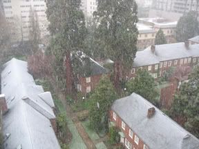 yep, it snowed in portland this morning -- a highly unusual event for the city, let alone this late in the season. i don't know if you can see it in this picture, but the snow was absolutely beautiful, just like a giant snow globe outside our window.